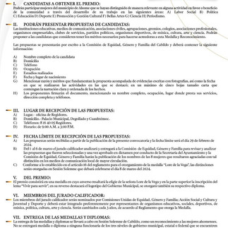 Las ediles informaron que las candidatas a obtener el Premio deben ser mujeres ahomenses que se hayan distinguido de manera relevante en alguna actividad en favor o beneficio de la comunidad, a través del desarrollo de su trabajo en áreas como: Labor Social; Política; Educación; Deporte; Promoción y Gestión Cultural; Bellas Artes; Ciencia, y; Periodismo.