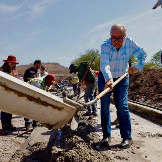 Durante su recorrido, el Gobernador Rocha, además de saludar, conversar y echar unas paladas de mezcla con los trabajadores, constató los trabajos que se realizan sobre esta importante rúa, la cual presenta un avance del 75% y estará concluida para el mes de septiembre.