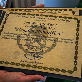 De igual manera, se hicieron entrega de Menciones Honoríficas de la Secretaría de Marina por haber participado en operaciones de navales, coadyuvando en el aseguramiento de estupefacientes, combustibles y embarcaciones en este primer semestre del año, al capitán de Navío, Leocadio Mar Mar; y al también capitán de Navío, Máximo Eduardo Rodríguez Villalobos, quienes recibieron sus diplomados de manos del gobernador Rocha y del almirante Abarca.